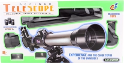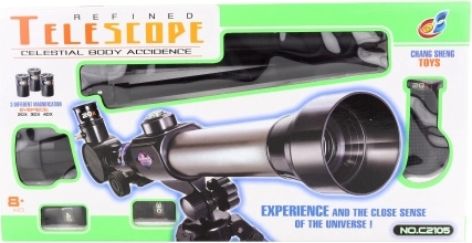Plastowy teleskop ze statywem. Średnica obiektywu 60 mm, odległość ogniskowania 170 mm, powiększenie 20x, 30x i 40x. Wymiary opakowania ok. 43 × 22 × 8 cm. Wiek 8+