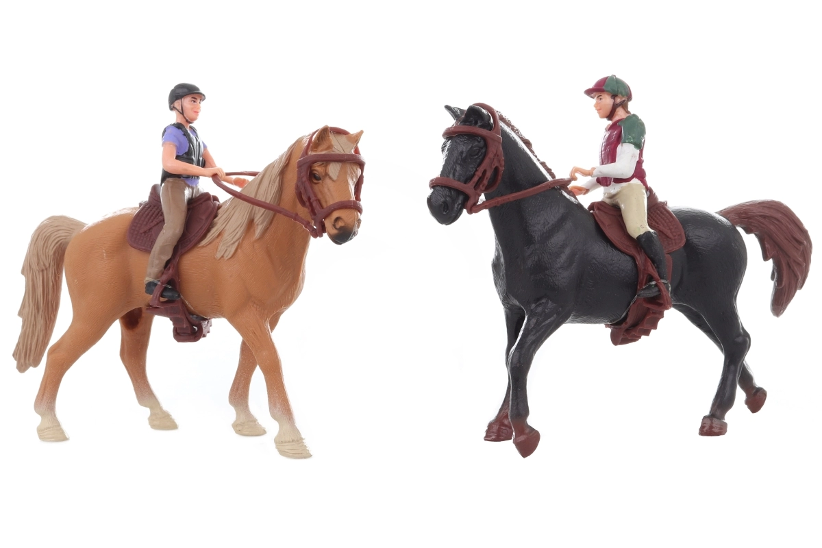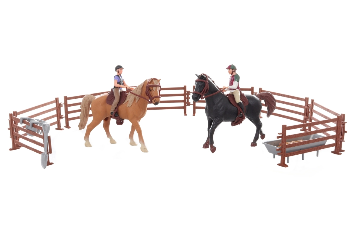 - Kompletny zestaw – 2 konie, 2 jeźdźców, zagroda i dodatkowe akcesoria.