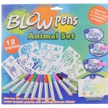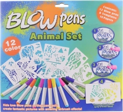 - 12 kolorowych flamastrów, 8 szablonów, 6 arkuszy papieru, kartonowa podstawka z uchwytem, nakładka do dmuchania z pompką
