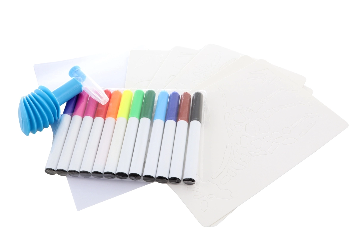 - Bogate wyposażenie – 12 flamastrów, 8 szablonów, 6 arkuszy i praktyczna podstawka.