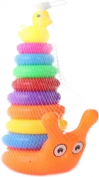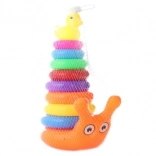 Uroczy słupek z kółkami w kształcie ślimaka ucieszy każde dziecko. Dzięki stopniowemu nakładaniu kółek maluchy ćwiczą cierpliwość, myślenie logiczne i zręczność. Ostatnim elementem jest plastikowa kaczuszka, która nadaje zabawie cel i dodatkową motywację.