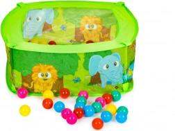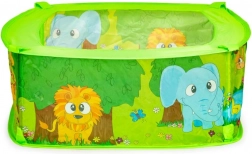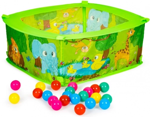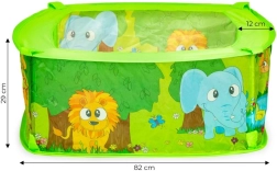 Zagroda z dnem z 50 piłeczkami – nie do wody, o wymiarach ok. 75 cm x 75 cm x 30 cm. W zestawie 50 piłeczek. Basenik można używać w domu w pokoju dziecięcym, a także latem na zewnątrz w ogrodzie. Dzieci będą miały mnóstwo zabawy podczas gry. Wiek 6m+