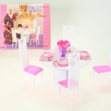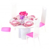 Stylowy zestaw jadalniany dla lalek Glorie zamieni każdą dziecięcą zabawę w realistyczną ucztę. Zawiera okrągły stół, 4 krzesła oraz 4 kompletne zestawy nakryć. Idealny do kreatywnej zabawy i rozwijania wyobraźni dzieci od 3 lat.