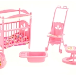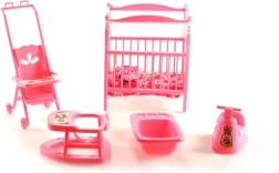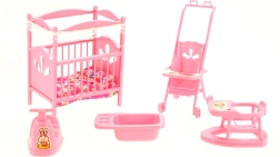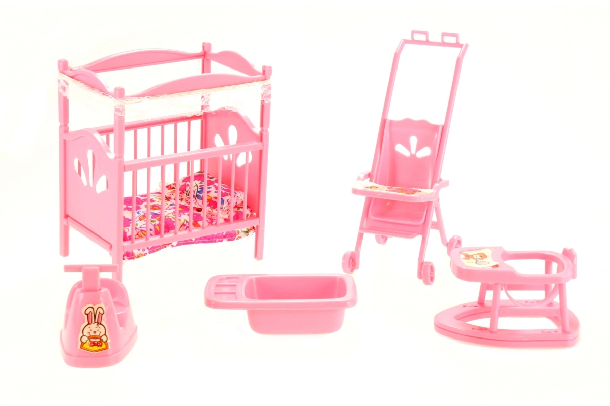 Kompletny zestaw do dziecięcego pokoiku dla lalek GLORIE ucieszy każdego małego opiekuna. Znajdziesz w nim łóżeczko z kołderką i poduszeczką, wózek, chodzik, nocnik oraz wanienkę – wszystko z wytrzymałego plastiku i w rozmiarach idealnych do zabawy. Świetny do rozwijania wyobraźni i zabawy w odgrywanie ról. Odpowiedni od 3 lat.