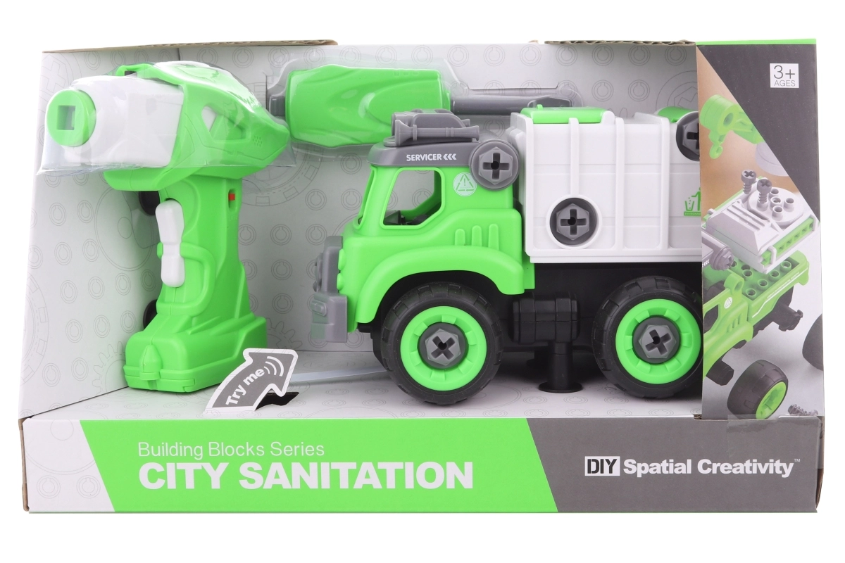 Zabawna i edukacyjna wkręcana śmieciarka zdalnie sterowana dla dzieci od 3 lat. Dzieci łatwo złożą pojazd za pomocą dołączonego śrubokręta lub wiertarki. Po włożeniu silniczka do auta można nim sterować do przodu i do tyłu, a pojazd dodatkowo wydaje realistyczne dźwięki. Interaktywna zabawa, rozwój motoryki małej i łatwe sterowanie w jednym.