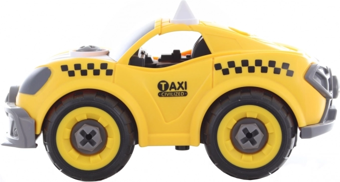 Buduj, wkręcaj i jedź! Ten kreatywny zestaw łączy wkręcany model żółtego taxi z możliwością przemiany w auto na zdalne sterowanie. Dzieci najpierw samodzielnie składają auto przy użyciu śrubokręta lub wiertarki, a następnie wyjmują silniczek z wiertarki, wkładają go do auta i cieszą się prostym sterowaniem do przodu i do tyłu.