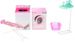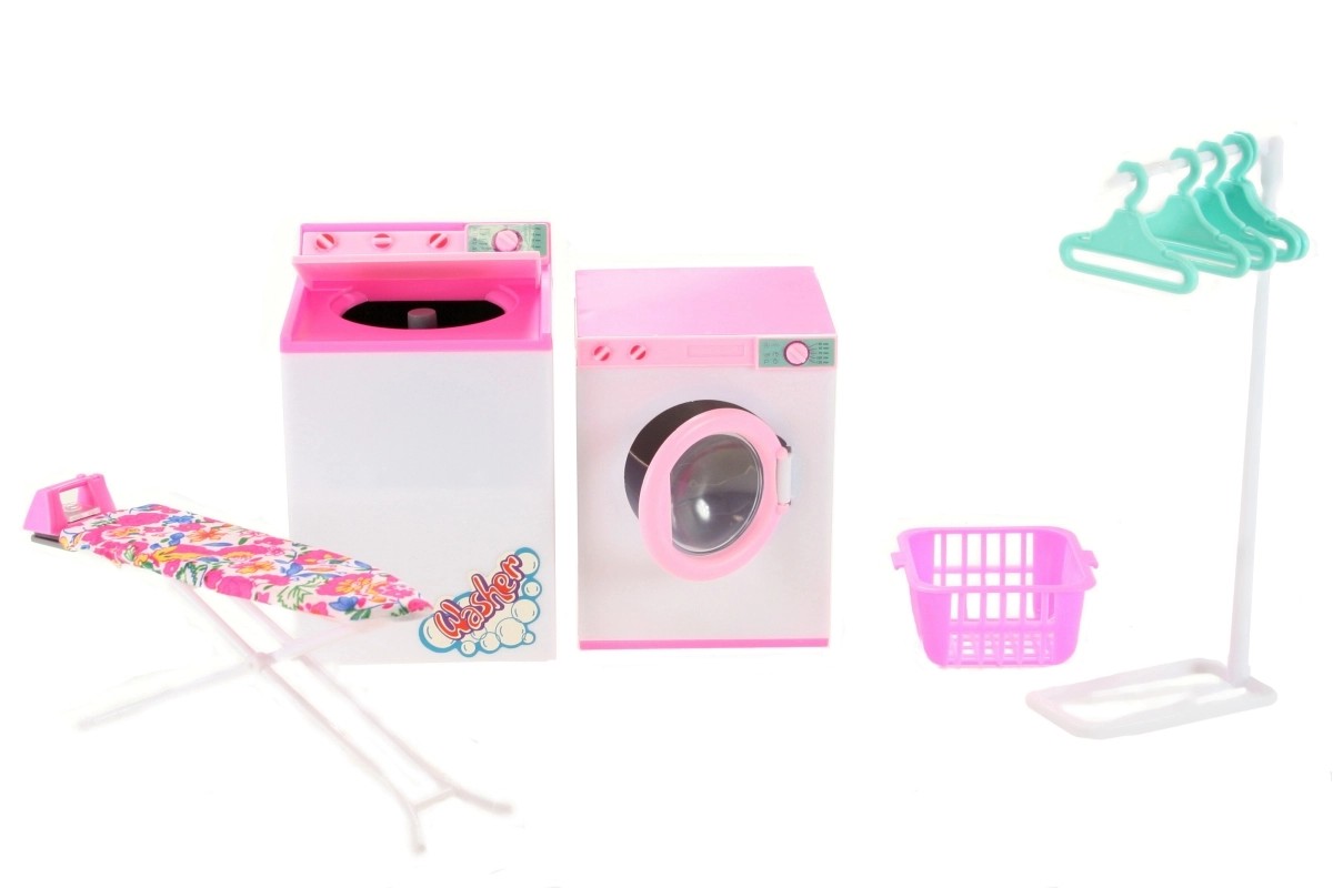 - Zawartość zestawu: pralka (otwierane przednie drzwiczki), suszarka (otwierana górna pokrywa), deska do prasowania, żelazko dla lalek, stojak na ubrania z 5 wieszakami, koszyk na pranie