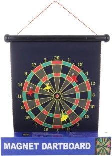 Zabawny zestaw dla małych i dużych, zawierający magnetyczną tarczę i cztery rzutki. Idealny do bezpiecznej zabawy w domu, dla dzieci od 3 lat.