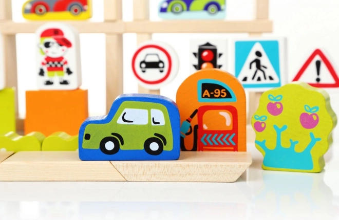 Transportowa konstrukcja w mieście przyciąga dzieci dzięki połączeniu kolorowych drewnianych klocków, które można zestawić w postać ruchliwego miasta pełnego aut, sygnalizacji świetlnej i stacji benzynowych. Doskonale rozwija zdolności sensoryczno-motoryczne, myślenie kreatywne i umiejętności logiczne.