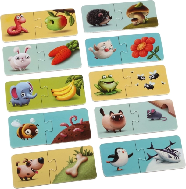 Dzieci układają 10 dużych par i w naturalny sposób przyswajają wiedzę o tym, co jedzą poszczególne zwierzątka – w sposób zabawny, sensowny i bez nudy.