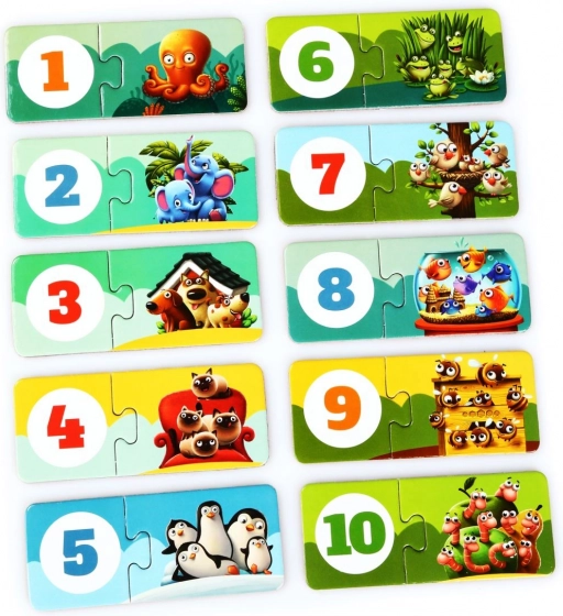 Odkryj naukę przez zabawę z puzzlami PUZZLIKA, które towarzyszą dzieciom w pierwszych krokach w świecie liczb. Każda para łączy ilustrację grupy zwierzątek z odpowiednią cyfrą, co naturalnie rozwija liczenie od 1 do 10, percepcję wzrokową i rozumienie zależności. Duże i solidne elementy są wygodne do chwytania i układania.