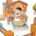 Drewniany zestaw Pizzeria od marki Cubika oferuje dzieciom możliwość zanurzenia się w świat fantazji i magicznej kulinarnej atmosfery pizzerii. Zestaw zawiera 30 drewnianych elementów i 12 kartonowych dodatków tematycznych. Wszystko wykonane jest z wysokiej jakości i bezpiecznych materiałów, które spełniają surowe normy europejskie.