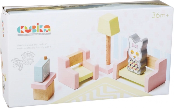 Odkryj urok zabawek Cubika z salonem dla lalek, wykonanym z ekologicznie pozyskiwanego drewna z precyzyjną obróbką i nowoczesnym designem. Zestaw zawiera 9 elementów, w tym drewnianą sofę, fotel oraz magnetyczne akcesoria.