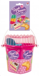 - Wiaderko w kształcie serca z pokrywką, łopatka, grabki, 4 foremki (lody kręcone, lód na patyku, placek z kratką, rogalik)
