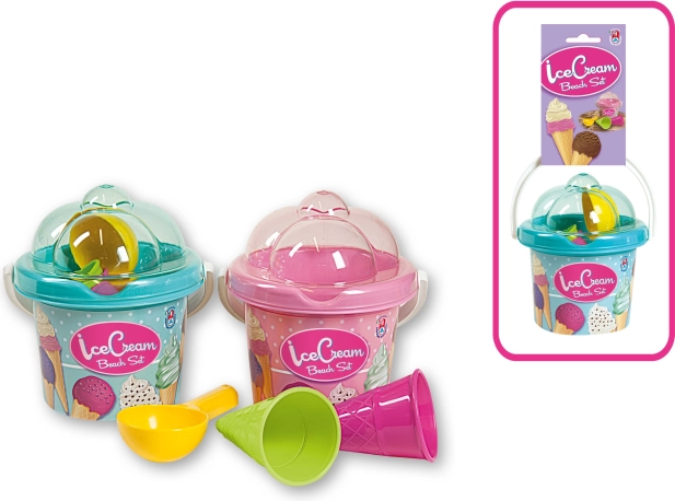 Dzięki kompaktowym wymiarom zestaw z łatwością mieści się do wózka lub torby plażowej. Wiaderko z pokrywką w kształcie pucharka lodowego utrzymuje wszystko w porządku, a jednocześnie stanowi ciekawy element zabawy.