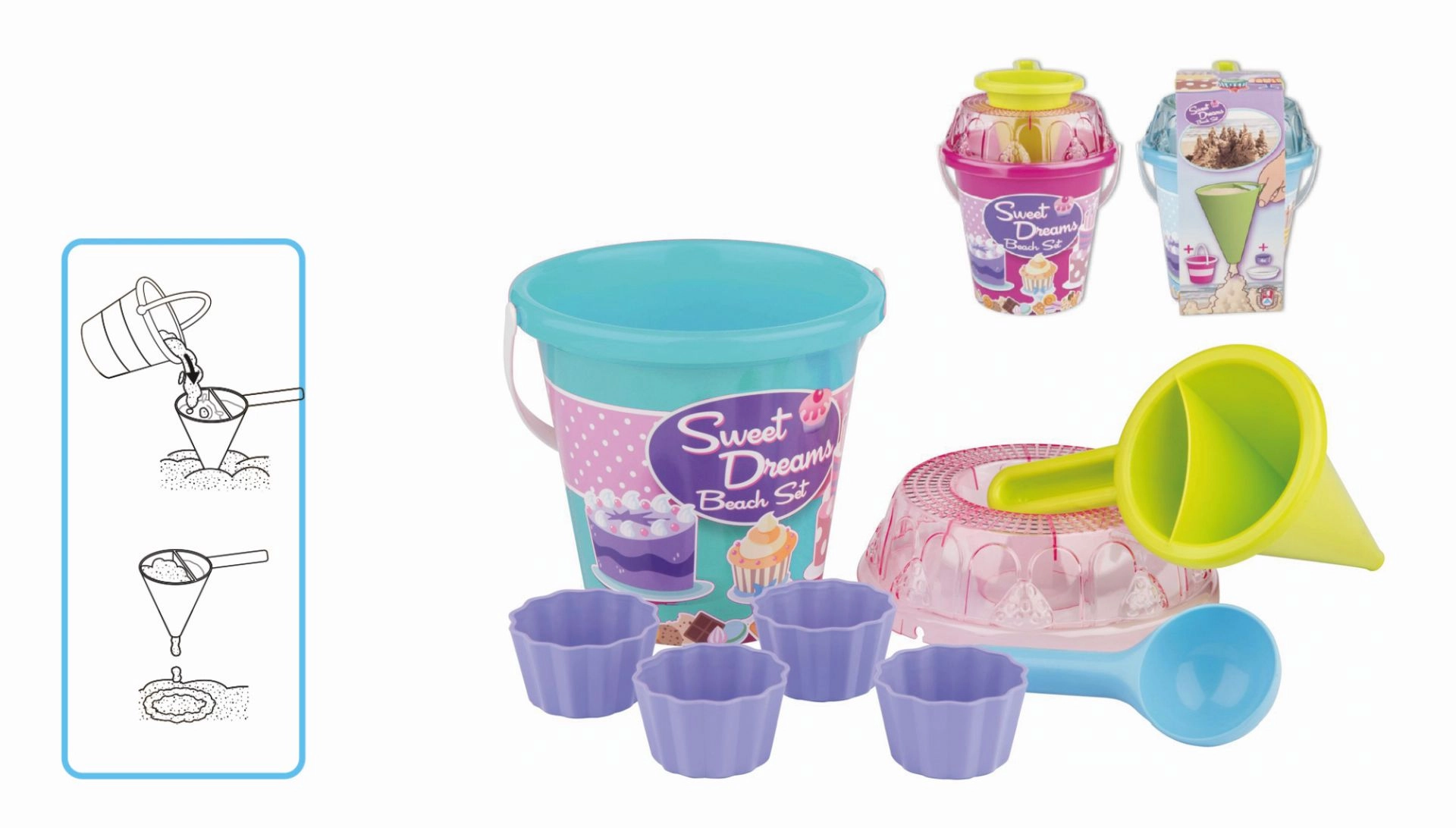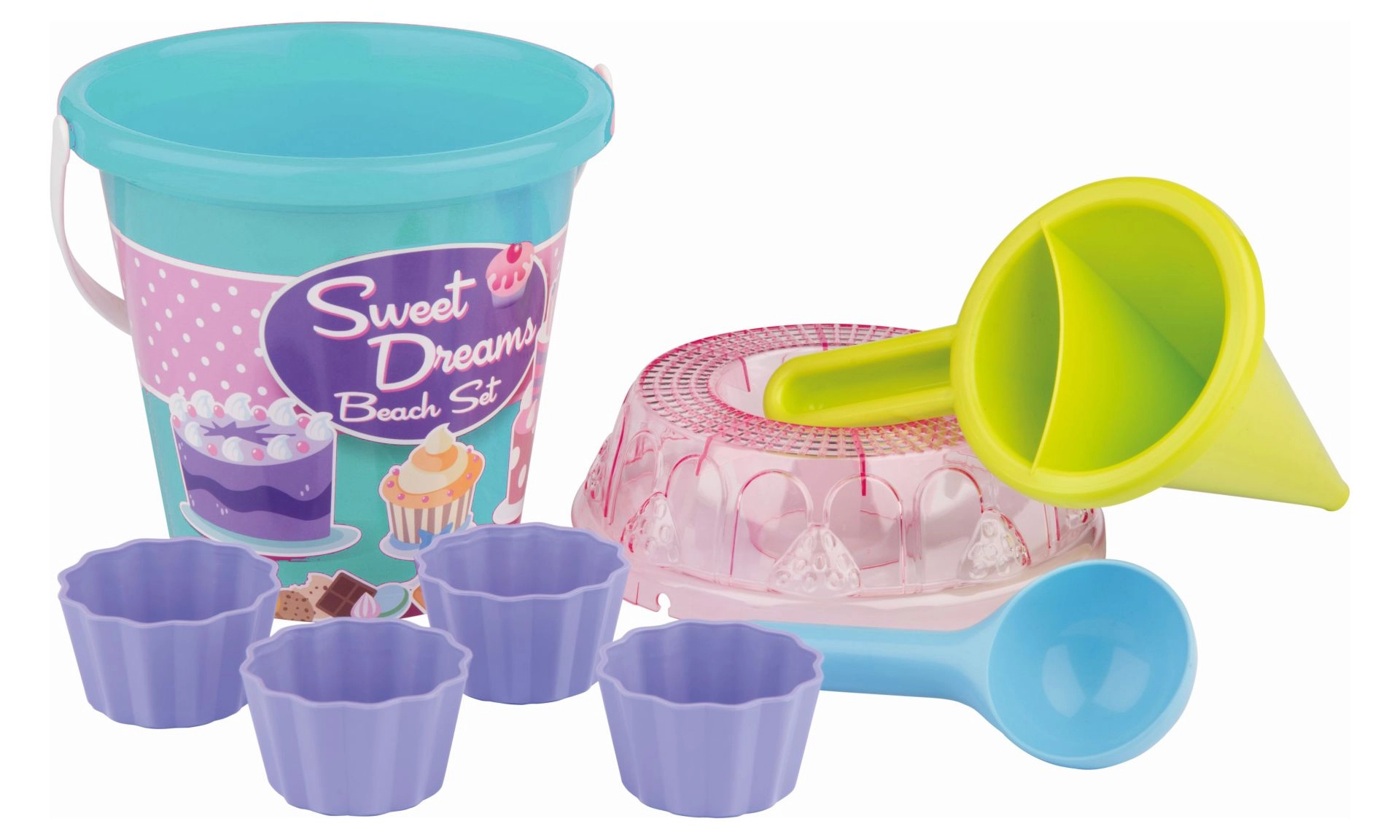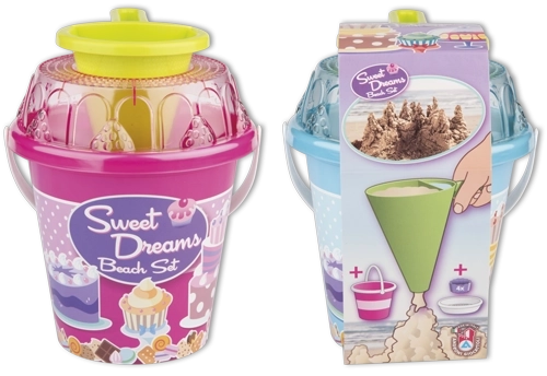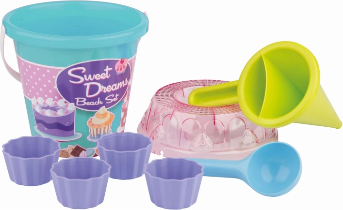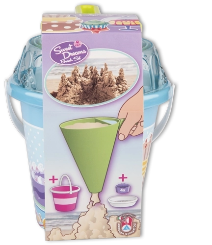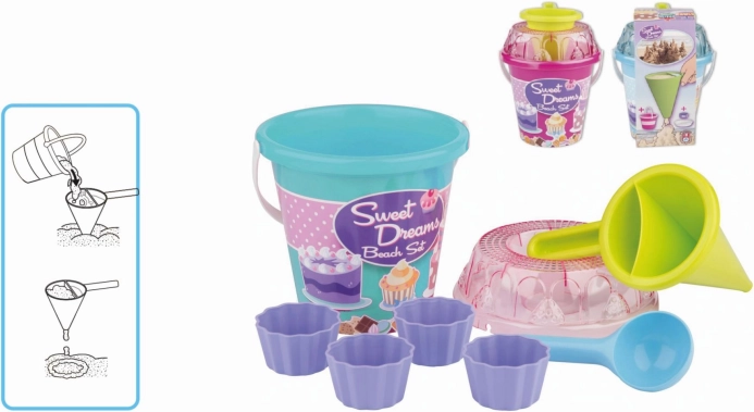 - Wiaderko, przezroczyste sitko w kształcie tortu, łopatka, 4 foremki w kształcie babeczki, lejek dekoratorski