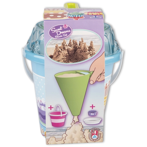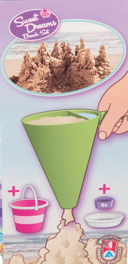 Odkryj kreatywną zabawę na plaży i w piaskownicy z tym 8‑częściowym zestawem od Androni. Zawiera wiaderko, przezroczyste sitko w kształcie tortu, łopatkę, 4 foremki oraz lej dekoratorski do mieszania piasku i wody. Wyprodukowany we Włoszech z wysokiej jakości tworzyw, odpowiedni już od 12 miesięcy.