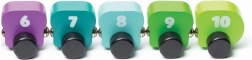 Dziesięć elementów ponumerowanych 1–10 tworzy płynną tęczową skalę. Dzieci utrwalają kolejność liczb i rozróżnianie kolorów poprzez naturalną zabawę.