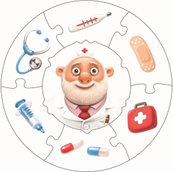 Okrągłe puzzle z postacią lekarza uczą dzieci rozpoznawać podstawowe akcesoria medyczne – od stetoskopu po termometr – i rozwijają ich słownictwo oraz logiczne przyporządkowywanie.