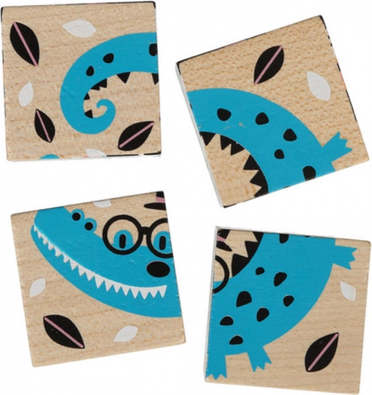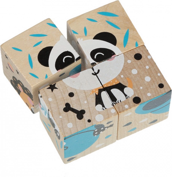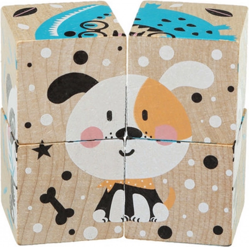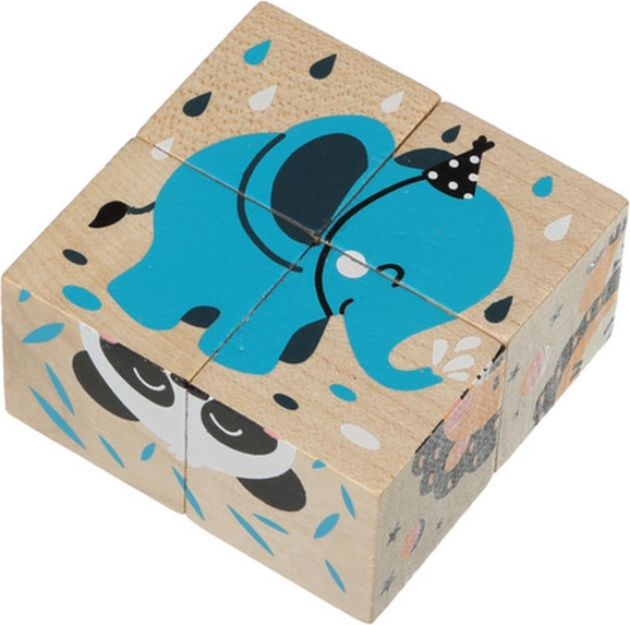 Drewniane układanki Radosne zwierzątka umożliwiają dzieciom ułożenie aż sześciu różnych obrazków z radosnymi zwierzątkami. Każda z czterech kostek jest starannie wykonana z ekologicznie hodowanego klonu i buka oraz pokryta bezpiecznymi farbami wodnymi. Kluczowe cechy: