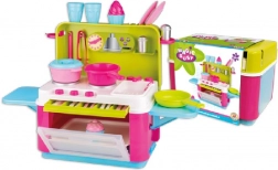Ta blatowa kuchnia jest idealna w podróży i do małych dziecięcych pokojów. Dzięki dwóm bocznym, nośnym i odpinanym blatom oferuje więcej miejsca do zabawy, a jednocześnie łatwo się przenosi. W zestawie znajduje się piekarnik z blachą, płyta grzewcza, zlew z baterią oraz bogaty komplet naczyń – wszystko do realistycznej zabawy w gotowanie.