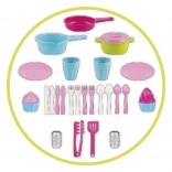 - Zawartość opakowania: zestaw sztućców dla 4 dzieci, szuflada na sztućce, piekarnik z blachą, płyta grzewcza, zlew z baterią, 3 garnki, 2 szklanki, 2 talerzyki, 2 szczypce, solniczka, pieprzniczka i 2x babeczka