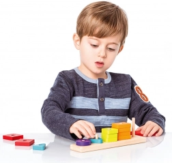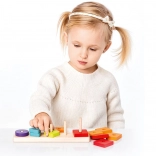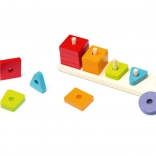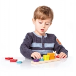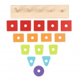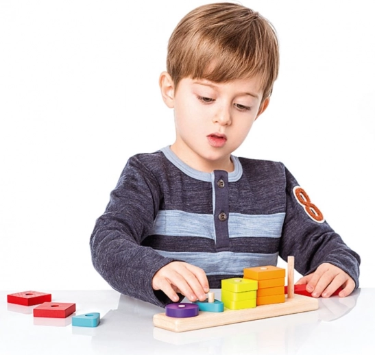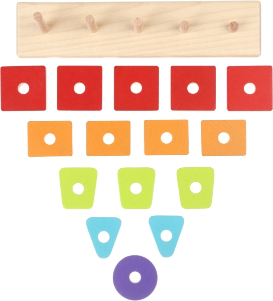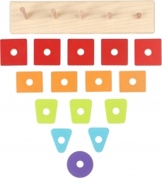 Dzięki różnym geometrycznym elementom i powtarzającym się kolorom dzieci łatwo opanują sortowanie, parowanie i prawidłowe umieszczanie na kołkach podstawy.