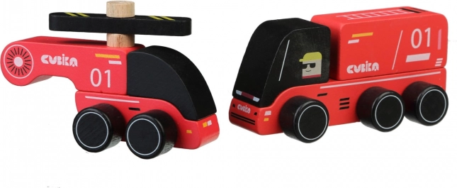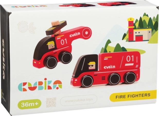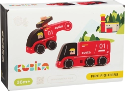 Drewniany zestaw CUBIKA strażacy zawiera jedno autko strażackie i jeden helikopter z wysokiej jakości klonu i buku. Dzięki zaokrąglonym krawędziom oraz bezpiecznym farbom wodnym jest idealny dla dzieci od 3 lat. Certyfikaty TÜV i europejska norma EN 71 gwarantują wysoki poziom bezpieczeństwa. Wyprodukowano w Europie. Długość auta 12 cm, helikoptera 10 cm.