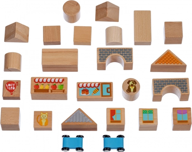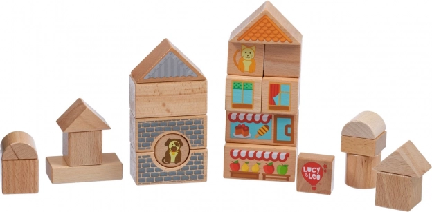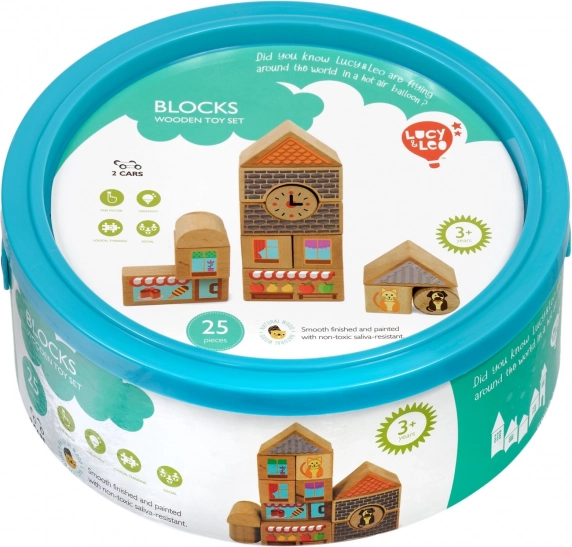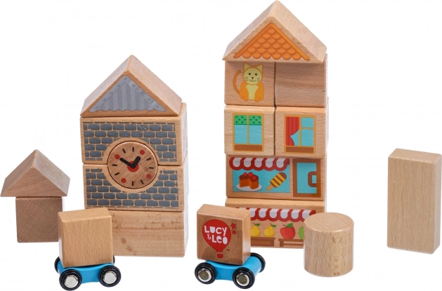Odkryj magię kreatywnego budowania z drewnianym zestawem Lucy & Leo miasteczko. Zestaw zawiera 25 wysokiej jakości drewnianych elementów, w tym 2 jeżdżące autka, różne kształty i kolory do budowy domków i uliczek. Ilustrowane elementy, takie jak okna, dachy i witryny sklepowe, pobudzają wyobraźnię i tematyczną zabawę. Zabawka wspiera motorykę małą, logiczne myślenie i kreatywność, a po zabawie łatwo schowasz ją do praktycznego okrągłego pudełka z pokrywką i rączką.