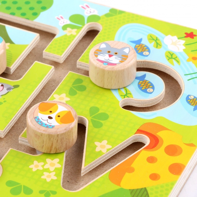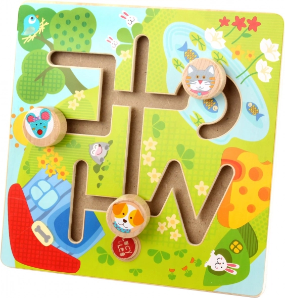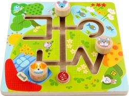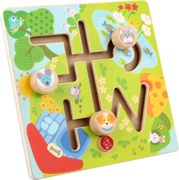 Drewniany labirynt Słoneczna Dolina daje dzieciom radość odkrywania i nauki. Ilustrowana plansza ze stawem i zielenią wciąga do zabawy, w której pies, kot i myszka podążają do swoich celów. Dzięki płynnym rowkom figurki łatwo się przesuwają, a zabawa jest bezpieczna i intuicyjna.