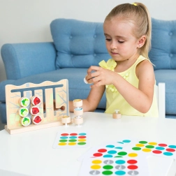 Zestaw zawiera 6 dwustronnych kart z kolorowymi wzorami. Dzieci umieszczają kołeczki we właściwych pozycjach według kart i rozwijają logiczne rozumowanie.