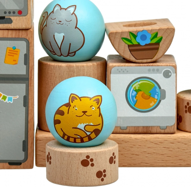 - Solidne drewniane elementy z wesołymi ilustracjami kotów i domowych przedmiotów