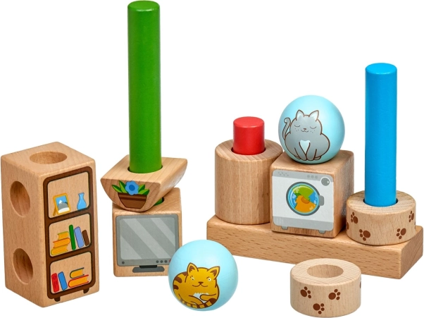 Trwałe drewniane kształty z gładko szlifowaną powierzchnią i ilustrowanymi motywami kotków oraz przedmiotów. Idealne dla małych dziecięcych rączek.