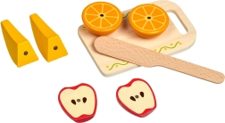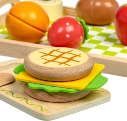 Solidne drewniane elementy uzupełniają tekstylne plastry sera i sałaty. Trwałe wykonanie i nasycone kolory zapewniają długą i bezpieczną zabawę.