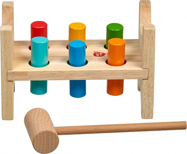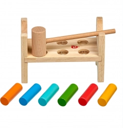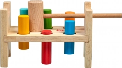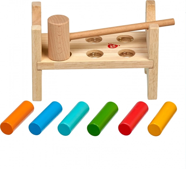 Sześć kolorowych kołków i drewniany młoteczek uczą dzieci precyzyjnego chwytu, siły uderzenia i koordynacji ręka–oko.