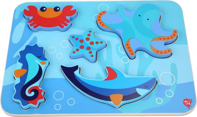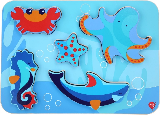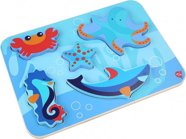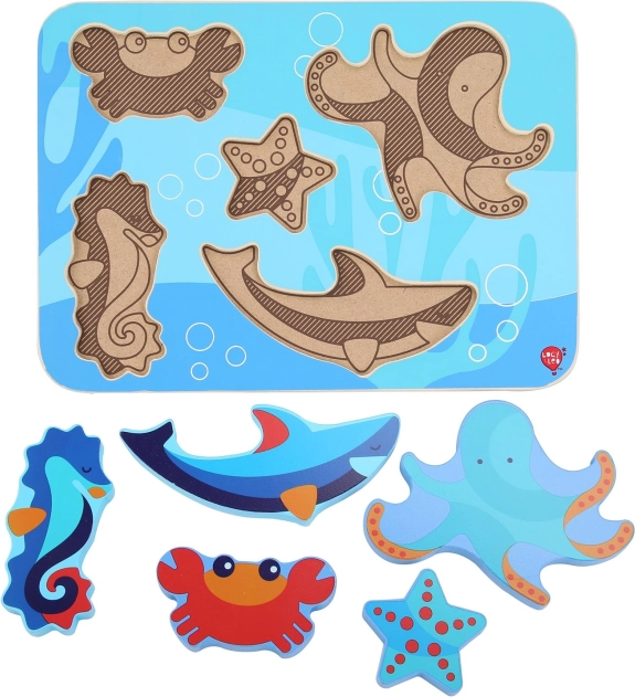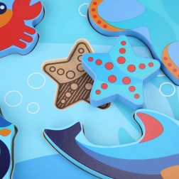Drewniane puzzle dla dzieci z motywem morskich stworzeń zostały zaprojektowane do nauki przez zabawę. Sześć kolorowych elementów – na przykład ośmiornica, rozgwiazda czy konik morski – idealnie pasuje do frezowanych kształtów na solidnej podstawie z oceanicznym motywem. Elementy są wystarczająco duże, by dobrze leżały w dłoni, a dzięki grubości mogą samodzielnie stać.