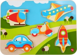Ta wysokiej jakości drewniana układanka–wkladanka z motywem środków transportu zachwyca wyrazistymi kolorami i czytelnymi kształtami, które dzieci łatwo chwytają i umieszczają na swoim miejscu. Niektóre elementy dzięki swojej grubości mogą samodzielnie stać, więc dzieci mogą bawić się nimi także poza podkładką.