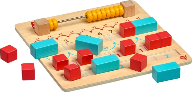 - Drewniana tablica z liczydłem, 10 czerwonych kostek, 5 niebieskich prostopadłościanów