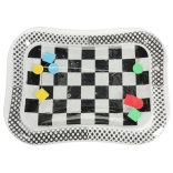 Mata ma czarno-biały wzór szachownicy, który naturalnie przyciąga dziecięcą uwagę i pomaga stymulować percepcję wzrokową.