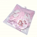 Ten dwuczęściowy strój został zaprojektowany specjalnie dla lalki-niemowlęcia New Born o wielkości 26 cm. Zawiera dwustronny kocyk z kapturem, który chroni lalkę i nadaje jej wygląd prawdziwego niemowlęcia.