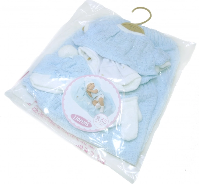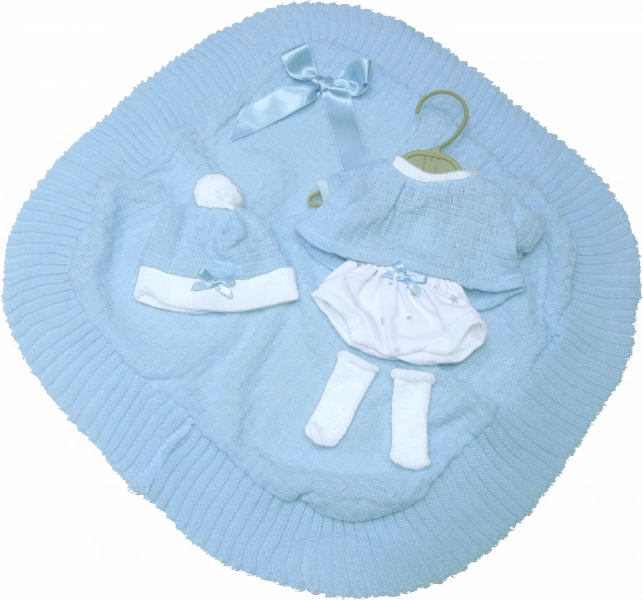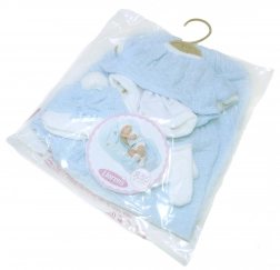 Eleganckie 4-częściowe ubranko dla lalki New Born o wielkości 35-36 cm zawiera ozdobny kocyk z kokardą. Idealny zestaw do zabawy i stylizacji Twojej lalki.