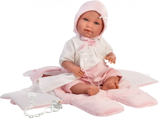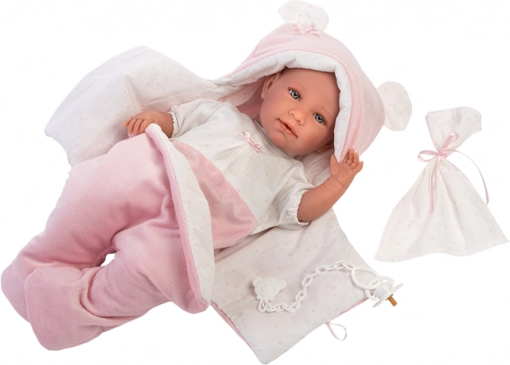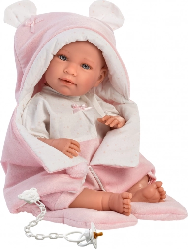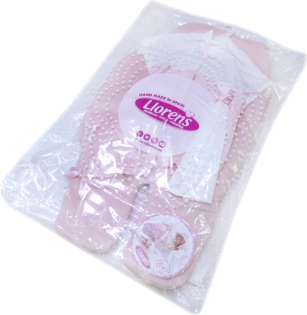 Ten piękny zestaw dla lalek jest wyprodukowany w Hiszpanii i zawiera dwuczęściowy zestaw, który jest idealny dla lalek NOWORODEK o rozmiarze 40-42 cm. Garnitur jest dostarczany z aksamitnym szybkim śpiworkiem do fotelika samochodowego i ozdobną chusteczką, co dodaje lalkom realistyczny wygląd.