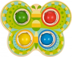 Kolorowy motyl z otworami na cztery kulki (zielona, czerwona, żółta, niebieska) pomaga w rozpoznawaniu kolorów i utrzymaniu uwagi.