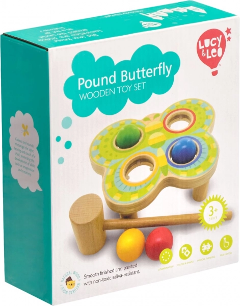 Ta wysokiej jakości drewniana zatłukiwanka w formie motyla ucieszy dzieci wesołymi barwami i sprytną zasadą zabawy. Dziecko delikatnie uderza młoteczkiem w kolorowe kulki, które wpadają do otworów w tym samym kolorze, ćwicząc koordynację i rozpoznawanie barw.