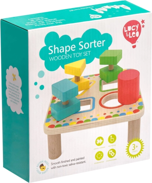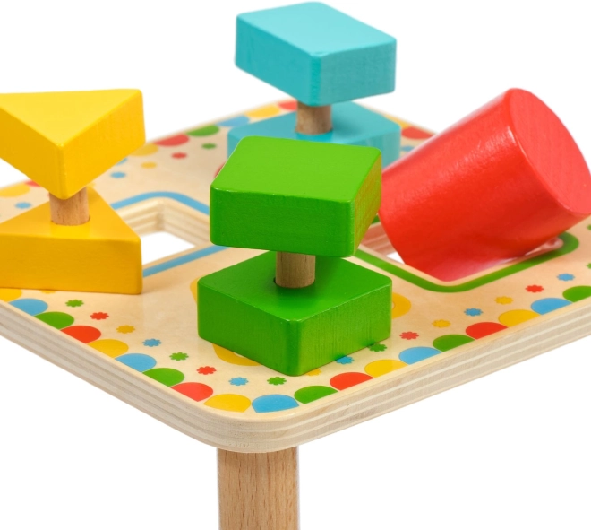 Plansza na stabilnych nóżkach ma cztery kolorowo obramowane otwory, które pasują do kolorów poszczególnych elementów. Zestaw idealnie sprawdzi się do samodzielnej zabawy i wspólnego odkrywania z rodzicami, a także świetnie nadaje się jako wysokiej jakości drewniana zabawka edukacyjna dla przedszkolaków.
