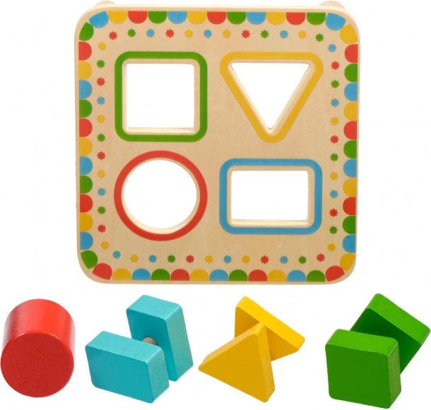 Cztery kolorowo obramowane otwory w planszy odpowiadają kolorom elementów. Dzieci łatwo przyswajają kolory i podstawowe figury geometryczne.