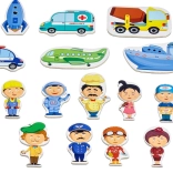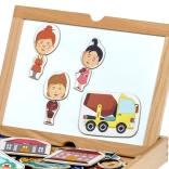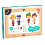 Ten kreatywny magnetyczny zestaw w przystępny, zabawowy sposób przybliża dzieciom świat zawodów – od strażaka i policjanta po kucharza czy pilota. Dzięki dwustronnym kartom dzieci mogą układać prawidłowe kombinacje lub tworzyć własne postacie i scenki. Praktyczna drewniana walizeczka z magnetyczną tablicą zapewnia wygodne przechowywanie wszystkich elementów oraz łatwe przenoszenie w podróży.