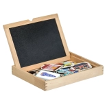 Pokrywa służy jako magnetyczna biała i czarna tablica. Dzięki dołączonemu markerowi, kredom i gąbce dzieci rysują, zapisują i łatwo wszystko ścierają.