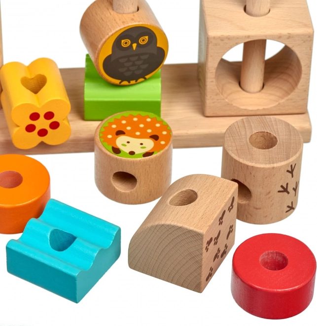 Stabilna baza i trzy kołki ułatwiają prawidłowe układanie elementów. Dzieci trenują małą motorykę i koordynację ręka–oko podczas nawlekania i układania.