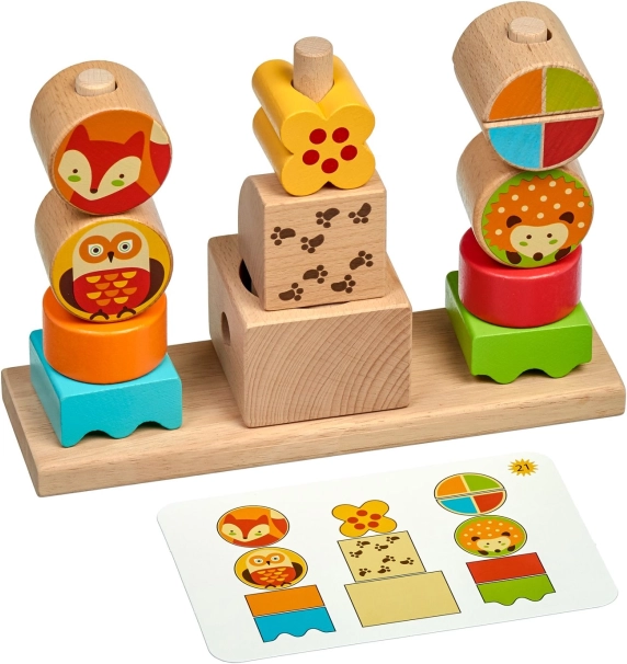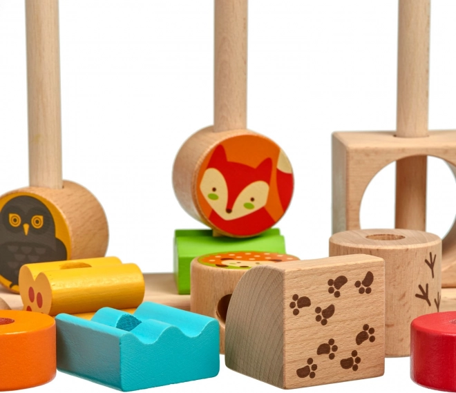 Klocki ze zwierzętami leśnymi i barwne geometryczne elementy przyciągają uwagę dzieci i pobudzają wyobraźnię. Idealne do kreatywnego budowania i swobodnej zabawy.